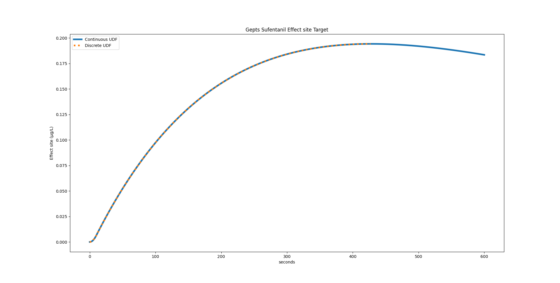 For the Gepts model, STANPUMP calculated a peak time of 428 seconds. Using the continuous UDF, we can calculate it to be at 427.99173072102536 seconds.