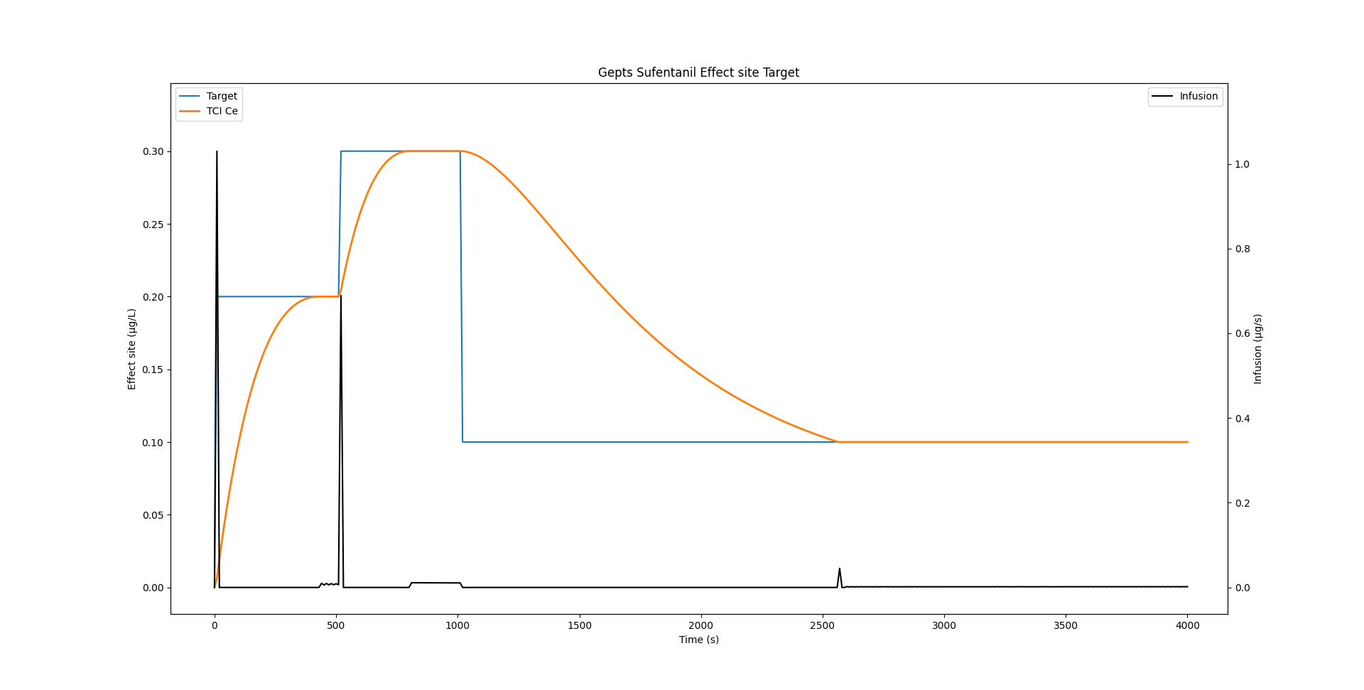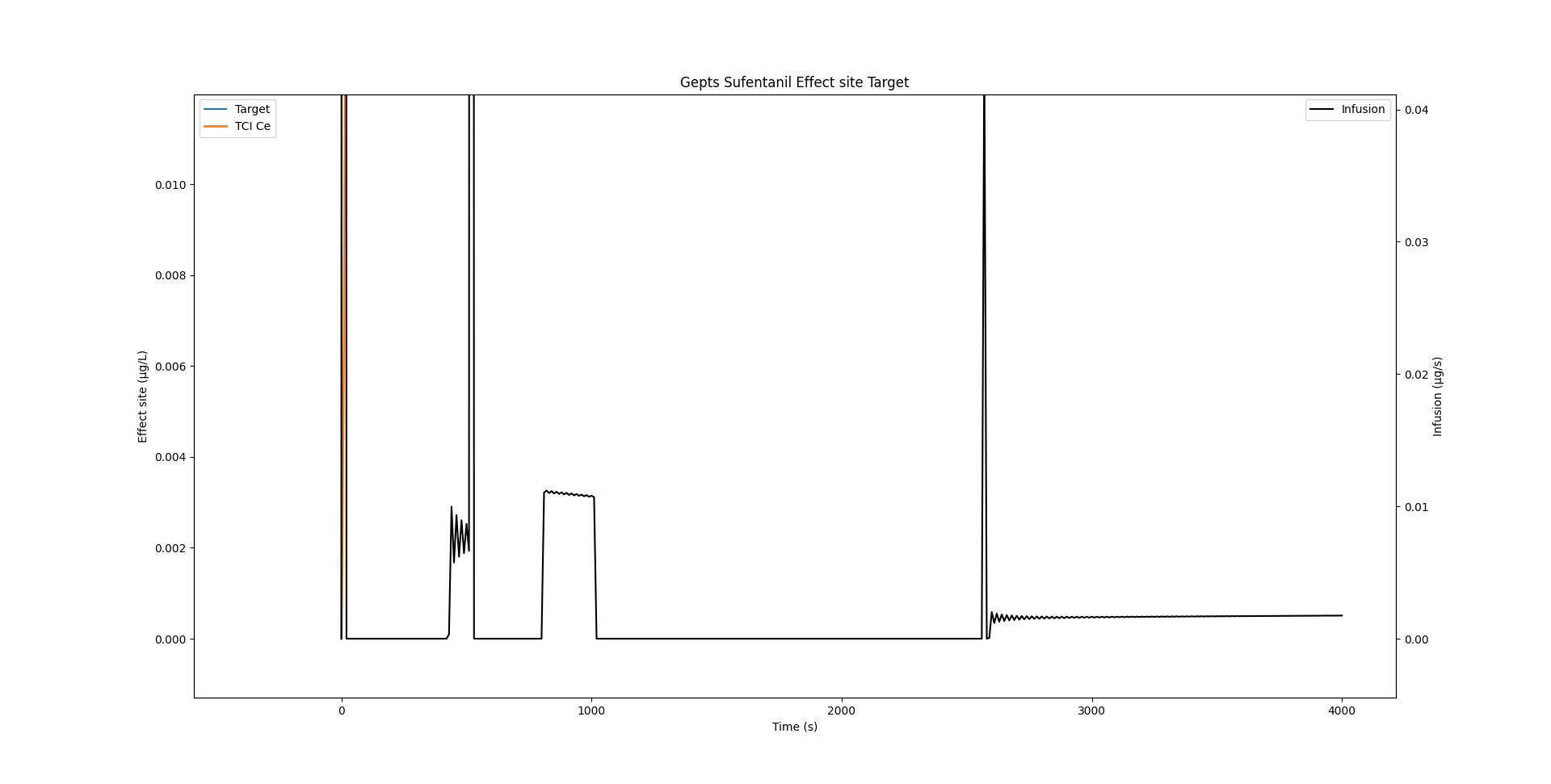 This algorithm rapidly converges on the correct solution for I. Implementation of this algorithm produces an oscillation of the infusion rate during maintenance of constant concentrations. This is a result of the use of discrete time rather than continuous time. Once the effect site concentration peaks at the target concentration, the effect site concentration necessarily equals the plasma concentration. In our own implementation we found that once the effect site concentration is within 5% of the desired target, we simply maintain the plasma concentration at the desired target, which is easily calculated
