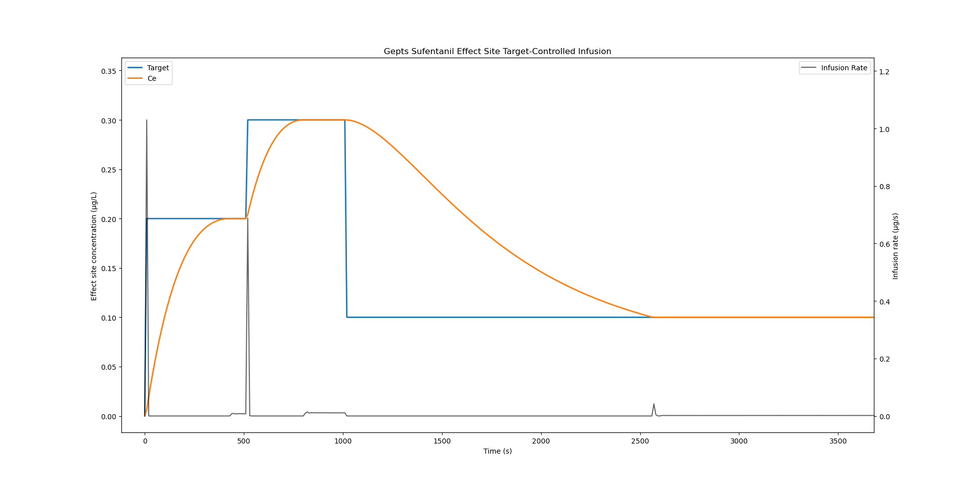 In this simulation, I set an intial effect site target at 0.2 μg/L. After 500 seconds it is increased to 0.3 μg/L and after 1000 seconds it is lowered to 0.1 μg/L.